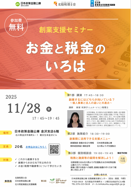 北陸税理士会、日本政策金融公庫、(公財)石川県産業創出支援機構による創業支援セミナーのご案内です。
