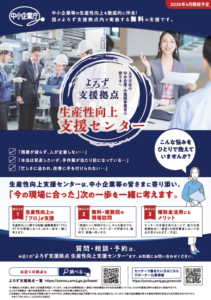 「生産性向上支援センタ-」は、中小企業・小規模事業者等の生産性向上(特に労働投入量の効率化)に向けて、複数回・現場訪問型の徹底した伴走支援を提供する組織です。よろず支援拠点のワンストップ相談窓口とも密に連携し、両組織で中小企業・小規模事業者等に必要な支援を提供します。